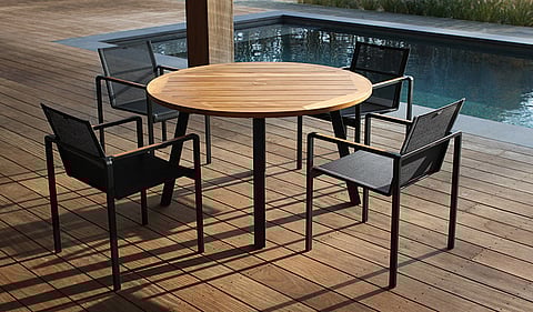 Completing the tri-fecta, the DISCUS circular table collection from Royal Botania is sure to become a classic. A modern version of a traditional teak dining table, it's available in electro polished or brushed stainless steel, as well as coated aluminum in stylish sand, white or black hues. The tabletop comes in teak or white, black or cafe latte colored glass and includes an opening for helicopter blades or an umbrella.