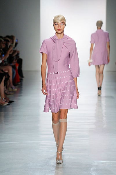Striped cotton sweaters are layered to enhance the classic tailoring with nonchalant modernity. Braided knit cardigans and neatly cropped jackets are paired with demure knee-length skirts and shorts, softened with touches of silk crepe. Inspired by Andy Warhol silkscreen portraits of iconic celebrities, the collection is rendered in vivid shades of rose, lavender, violet and red. Hand embroideries with natural glass beads impart drama and mystery, with a whimsical touch.