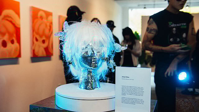 However, bringing the piece itself to Los Angeles from New York, the artist’s current home, presented some challenges. “It was a big piece to bring, and the logistics for it meant that if something broke or was deconstructed, I’d have to spend all day fixing it.” Woo stands by his choices for display though, happy to note that the rotational display and three-dimensional shapes enhanced the work greatly. He says audiences were captivated, especially with its lighting aspects – “they thought it stood out the most from all the pieces…It was inspired by a traditional Korean hairpin, so they were pleasantly surprised at how it was executed in a Y2K meets seventies disco manner, mixed into one piece.” The work is a new interpretation of a Korean traditional piece into what’s trending now, while “still looking to the past for those influences rather than from the future,” says Woo.