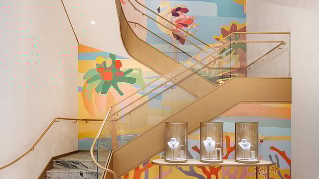 Cartier’s expanded flagship arrives with architectural flair, pairing Liz Diller’s rippling fluted glass façade with interiors shaped by Laura Gonzalez. Miami-inspired motifs appear throughout, including leaf accents, seashell references, and colorful tilework on the roof terrace. Inside, the Maison unveils a sophisticated environment for its full collection of jewelry, watches, fragrance, leather goods, and accessories. The flagship becomes a natural stop for visitors moving between exhibitions and installations during Art Week.