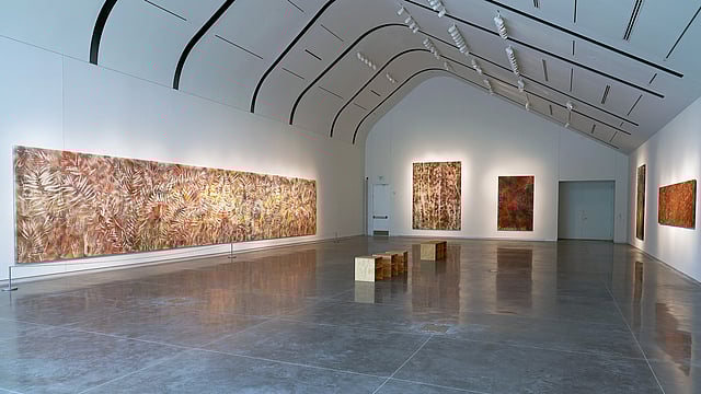 Working directly on the ground, Falls arranged local leaves, flowers, and branches across expansive canvases, spraying them with pigment and allowing humidity, rain, and time to leave their mark. The resulting impressions capture both the ephemeral beauty of the natural world and Ruinart’s long-term commitment to sustainability.