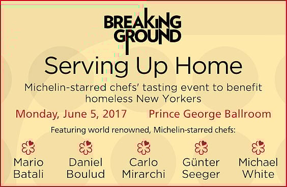 Breaking Ground today announced Serving Up Home, a one-night-only benefit event featuring Michelin-starred chefs Mario Batali, Daniel Boulud, Carlo Mirarchi, Günter Seeger, and Michael White to support critical services for New York City's homeless. On Monday, June 5th at 7:30 p.m., the chefs will prepare signature dishes to be served at a special fundraiser in the Prince George Ballroom for Breaking Ground, New York City's largest provider of street outreach services and supportive housing for homeless New Yorkers. Benefit attendees will enjoy the chefs' tasting dishes, passed assaggi by Il Posto Tuo as well as an open bar and gourmet desserts. Tickets are now on sale athttp://www.breakingground.org/servinguphome/. All proceeds will go directly to benefiting the nonprofit's street outreach and transitional housing services.