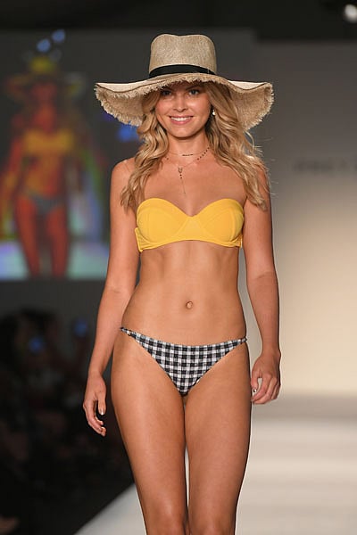 The runway looks, styled by fashion stylist Ali Dariotis in collaboration with Prey Swim's brand director and technical designer Kat Zepeda, were accessorized with jewelry designs by Luv AJ, Alisa Michelle, Les Deux and Briwok with hats by Gladys Tamez Millinery and sunglasses by Wildfox Boutique.