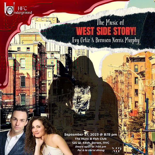 Mark your calendars for the upcoming show on September 27th as Hunt & Fish Club presents HFC Underground proudly presents an unforgettable night of music from the classic masterpiece, West Side Story. Get ready to experience the classic story of love and struggle inspired by Shakespeare's Romeo and Juliet. Evy Ortiz, renowned for her outstanding performances in West Side Story and The Fantasticks, will showcase her talents alongside the gifted Bronson Norris Murphy, who has captivated audiences with his roles in The Phantom of The Opera and Love Never Dies. It's an opportunity to fall in love with the beautifully innocent Maria and be moved by the passionate suitor, Tony. Indulge in the enchantment of this critically acclaimed adaptation with a mesmerizing portrayal that is sure to leave you spellbound.