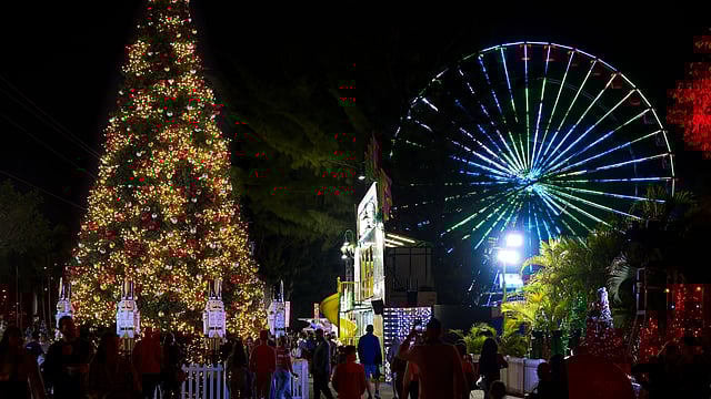The City of West Palm Beach brings holiday spirit to the waterfront with its beloved Sandi Tree, the world’s only 35-foot holiday tree made entirely of sand. Beginning December 4, the season includes nightly synchronized light shows, a Ferris wheel overlooking the Intracoastal, and festivities that extend across the city.