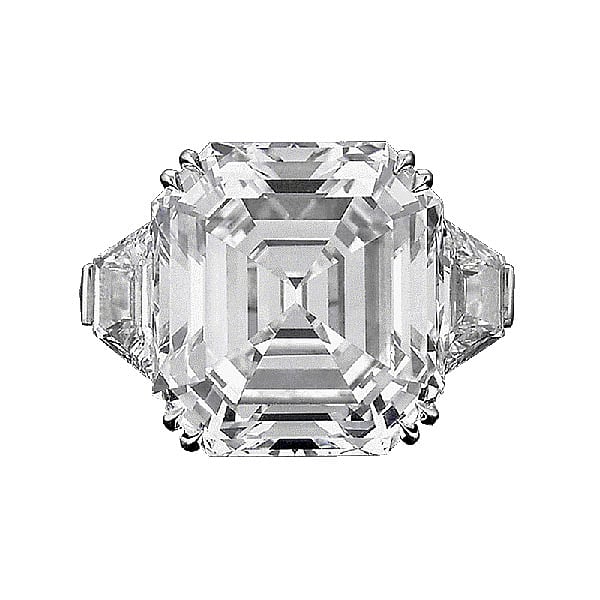 Known as the "Ultimate Diamond," Golconda diamonds possess a level of clarity, purity, and transparency unrivaled by any other stone. Spectacular size and rarity distinguish this 22.11-carat diamond, which is accented by two trapezoid-cut diamonds totaling 1.68 carats. This exceptionally rare Asscher-cut stone is graded as being a clear D-color, type IIa jewel – a full two shades whiter than the whitest diamonds. This is truly a fine diamond of legendary beauty and perfection.
