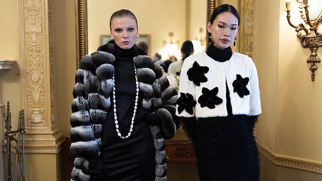With 31 carefully curated looks, the collection underscored the concept of wardrobe-building, where luxury meets versatility. Rich furs remained a signature element, with standout pieces including a brown mixed broadtail and sable mosaic coat, as well as a Bordeaux sheared mink coat with a chinchilla collar. Basso balanced these sumptuous outerwear pieces with equally refined eveningwear—think a black duchesse satin tuxedo gown embellished with crystals or a ruby satin-back crepe gown with a statement draped bow. Meanwhile, an off-white sheared mink coat paired with duchesse satin wide-leg trousers embodied an effortless grandeur.
