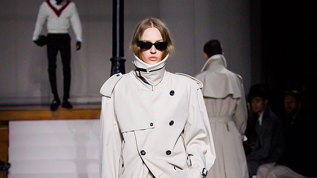 Outerwear carries much of the narrative weight this season. The trench coat, a cornerstone of British design, is reimagined through material and structure. Patent finishes give it a sharper presence, while softer shaping and high-collared cape interpretations introduce movement and variation.