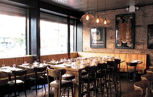 Seated at a small table set along a large plate glass window looking over the street, we enjoyed the clean well-lighted space of exposed brick walls, a wooden built-in banquette, soft lighting, oversized Asian art and the happy electric hum of pleased dinners.