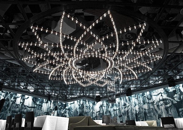 Situated in the heart of the theater district, Hunt & Fish Club transports you from the bustle of Times Square into a 9,000 square foot bastion of Gotham style glamour and high living that Jay Gatsby would approve of. To create this atmosphere artist Roy Nachum and Studio Iyor infused original artwork with over 50,000 pounds of marble covering the walls and floors to produce an old meets new aesthetic reflective of NYC for the bi level space where each dining area tells a different story. The retro luxe main dining room pays homage to the past with a 70s inspired cascade of chrome lighting, a grey palette of sumptuous banquettes, dark wood, beveled mirrored walls, and marble floors. The back green room features a wall of plants under a glass roof and a wall of sculpted Carrera marble. While the downstairs lounge reflects the hedonism of Caligula with extravagant nude marble Greco roman statues with sexy lighting that could only be a brainchild of a Wall Street powerhouse trio.
