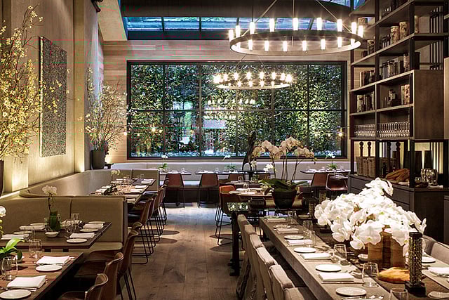 The design of the restaurant is subtle, and specific to this location. Gabby Karan De Felice has a taste for design, and for this latest venture she collaborated with architect Francis D'Haene, of D'Apostrophe Design. The Tribeca location is filled with industrial textures that are offset with warm lighting and floral accents. The artwork hung throughout is by the late Stephen Weiss. The bar is made from pure Italian stone, and is placed near the entrance to immediately welcome diners. The dining room features a communal table as the centerpiece, ensuring a lively atmosphere. Chandeliers were custom-made, hanging from high, vaulted ceilings. The lighting scheme promotes an intimate environment, and a touch of rustic Italy is added with the reclaimed wood floors.