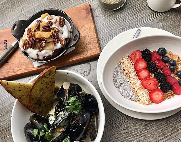 Share: Brunch items like Crispy Prosciutto and Mozzarella Egg Scramble with asparagus, Coconut Chia Seed Pudding with perfectly aligned berries, and Braised Short Rib Dip. The table next to us each ordered their own Breakfast Pizza covered in eggs, cheddar, bacon, and creme fraiche. Save room for the heavenly cinnamon roll in a skillet topped with roasted apples, toasted pecans, and vanilla cream cheese.