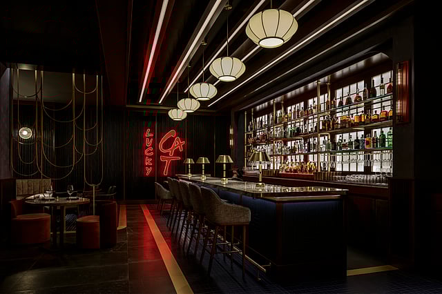 The design of Lucky Cat, with its rich wood textures, deep jewel tones, and custom brass accents, evokes a sense of timeless sophistication reminiscent of Tokyo’s chic kissatens. Art Deco-inspired lanterns and diffused lighting provide an elegant warmth that complements the bar and dining areas, drawing patrons into a space that feels both intimate and immersive.