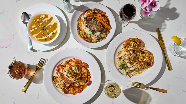 Entrées deliver nuance. The Braised Short Rib arrives with depth, lifted by jollof risotto, roasted carrots and red wine jus. A Pan-Seared Cod Fillet follows a lighter path, sharing the plate with mixed grains, brown butter and fennel-citric salad that adds lift. The Charred Cauliflower Steak brings a vegetarian centerpiece with harissa-tahini, crispy chickpeas and heirloom tomatoes, emphasizing texture as much as flavor.