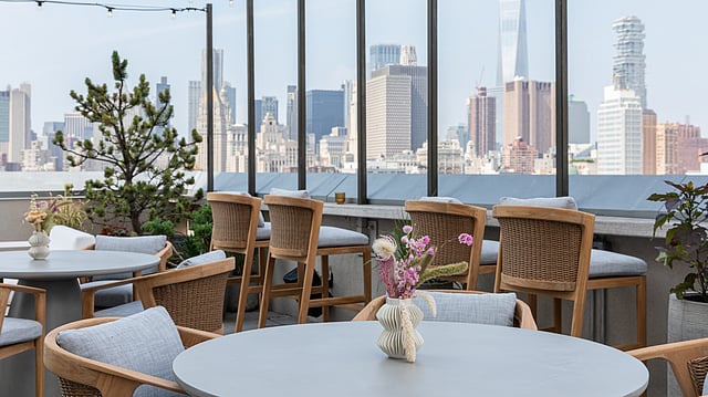 UNTITLED’s rooftop offers a more intimate way to experience the storm, tucked into the heart of the Lower East Side. The indoor-outdoor space features floor-to-ceiling windows, velvet seating, armchairs, and a wood-beamed ceiling that makes the room feel instantly welcoming. Views stretch across downtown and Midtown, creating a quiet contrast to the energy below. The new rooftop menu leans comforting, with offerings like warm sourdough grilled cheese paired with creamy tomato soup, perfect for snow watching with a glass of wine in hand. For those feeling playful, a quick step outside lets you catch a few snowflakes before retreating back indoors.