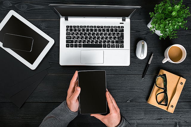 Hipster black wooden desktop top view, male hands typing on a laptop. Top view. Copy space