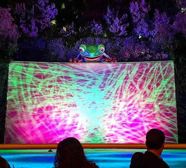 Beginning at dusk, every half hour til 11:30 pm, sip cocktails (or tea and coffee) at this water's edge view terrace. This nightly backdrop show comes alive with music and imagery with its 40 foot waterfall, 4,000 lights, stunning holographics, and puppetry. We smiled in delight at a massive moving frog moved to the music above the waterfall while later glowing orbs glided over the water, grew, and produced a baby orb. Take the escalator to Parasol Down or watch and dine at the SW Steakhouse.