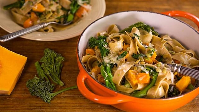 Earthy whole wheat pasta meets sweet roasted squash, bitter greens, and crunchy pumpkin seeds in a flavor-forward celebration of contrast and balance. It’s hearty, healthy-ish, and wholly delicious.