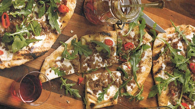 I love the charred flavor of grilled pizza. You can top it with anything, of course, but this version is one of my favorites. It's crispy and crunchy, kind of like a grilled cracker. Whenever I eat pizza I always give it a sprinkey-dink of crushed red pepper—it's just better with a little kick! That's why I make this infused oil for my pizzetta. It's an amazing way to get a big flavor bump, and while I love this chili oil on pizza, it's great on lots and lots of things.