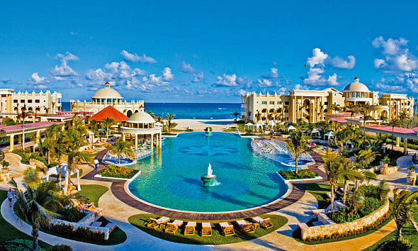 Each of the 600 stylish and chic rooms have panoramic views overlooking the ocean or lagoon with private balconies to enjoy the ocean breeze. The party gets started early with live bands playing by the central pool as well as DJ sets in the afternoon. For relaxation time, cozy up under a palapa on the white sandy beach and spend the day between the ocean and laying out on the daybed. There are plenty of dining options ranging from the brick oven pizza to the international buffet, as well as Japanese and contemporary Mexican, Italian and Brazilian a la carte restaurants. With six bars and lounges the party goes on til the wee hours of the night. Choose from the dive and splash pool or beachside bars by day and the music themed indoor Smash bar and steakhouse turned disco by night. If all this decadence leaves you yearning for a vacation transport yourself back to serenity at the Rock Spa and experience paradise all over again. •