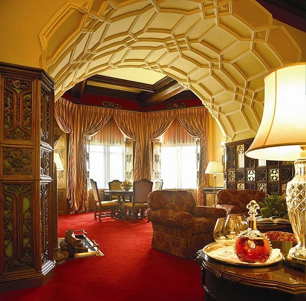 Adare Manor's most intriguing architectural secret is that it was conceived as a "Calendar House" with 365 stained glass windows for each day of the year, 52 chimneys for each week of the year, seven pillars in the cathedral-ceilinged lobby for each day of the week and four towers for each season. We moved into the Presidential Suite three hours after Bill Clinton checked out and searched high and low for any artifact he might have forgotten, sadly, we came up empty handed. This is the Manor's grandest suite with a dozen gothic, lead-paned windows overlooking the 840 acres of manicured grounds and parkland. There were sitting and dining areas appointed with important antique period furniture. The luxurious bedroom was anchored by a handsome hand-carved fireplace and the dressing room featured a freestanding bathtub that had a bird's-eye view of the formal gardens and rushing river.