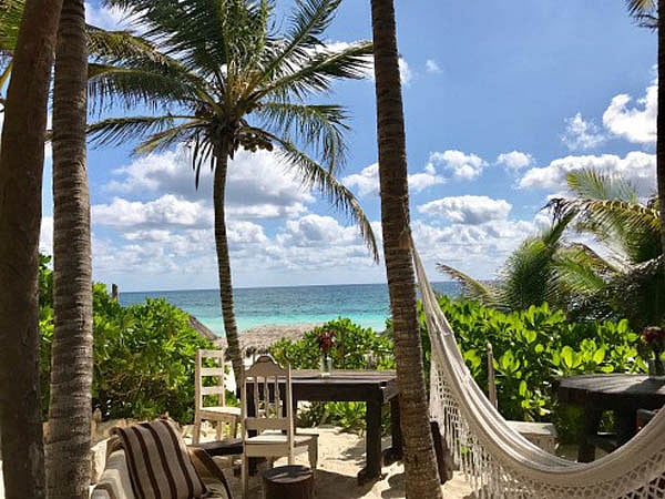 The mile long beach filled with a long row of sun beds and shaded hanging beds is the benefit of staying here, and you can snorkel right off the beach. One morning I enjoyed complimentary kundalini yoga beachside followed by an exquisite buffet breakfast in carved out tiered nooks at their rustic casual bar and restaurant facing the surf. A fashion shoot was in full effect as we sampled many tasty Mexican breakfast options. Another day we discovered Charly's Vegan Tacos, a taco truck with cool outdoor seating, which will make you reassess your feelings about veganism with their mango quac and taco trio.