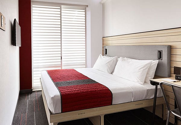 Across 28 floors, 665 rooms – in addition to the 45 Pod Pads – each about 115 square feet, include queen and bunk bed configurations, with features like built-in storage and high-tech amenities allowing guests to stream media content from smartphones or other devices.