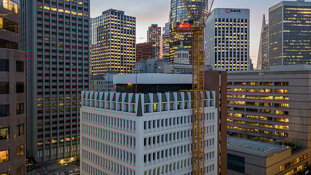 Rising thirteen stories above the Financial District, The Spear is undergoing a total reinvention by Presidio Bay, fueled by a ~$100 million investment. The transformation positions the property as a vibrant hub that combines premier office space with thoughtfully managed hospitality amenities, including the rooftop with panoramic Bay Bridge views. Construction has been underway since Summer 2025, with the installation of the first tower crane in Downtown San Francisco post-pandemic marking a visible milestone in the city’s resurgence. The rooftop is designed to support everything from intimate dining to large-scale gatherings and cultural programming, serving as a new focal point for both tenants and the broader community.