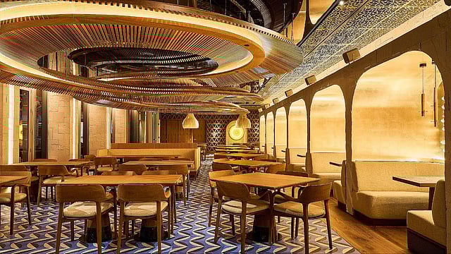 Paying homage to González Alcalá’s hometown, Morán sourced much of the restaurant’s art, furniture, and materials from Monterrey, Mexico. Upon arrival, guests enter through dramatic floor-to-ceiling golden double doors into a curated tequila gallery, where hundreds of rare and collectible bottles line the walls. At the heart of the space, a wall-mounted heart installation composed of hand-laid geometric forms serves as both a symbolic and visual centerpiece.