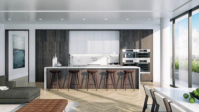 Bathed in natural light though full-height windows, the Villa's open floor plan features a gracious living room, kitchen and dining area that opens out onto the outdoor terrace. The chef's kitchen is furnished with custom-designed cabinetry and a marble island, countertop and backsplash. Stainless steel Miele appliances include a whole bean coffee system, dual convention ovens, a 24" speed oven, flush-mounted cooktop, dual warming drawers, and a wine storage system.