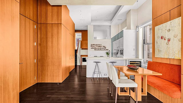 While the loft retains the openness associated with SoHo’s historic architecture, the interiors lean into a more contemporary sensibility. Hardwood floors run throughout, and a central air system with individual room controls adds a level of precision that older buildings often lack.