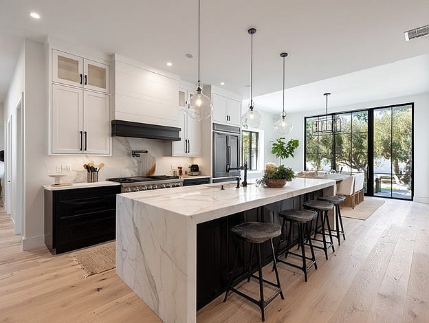 Some designers use different materials on the perimeter and island. For example, white countertops on the main counters and a rich black surface on the island. This adds dimension and gives your kitchen a custom look.