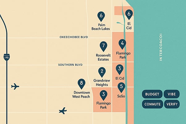 Lock in the commute. If most days revolve around Downtown, stay close. Flyers reach PBI in about 10 minutes via Southern or Okeechobee, while I-95 or Turnpike commuters should hug those corridors.