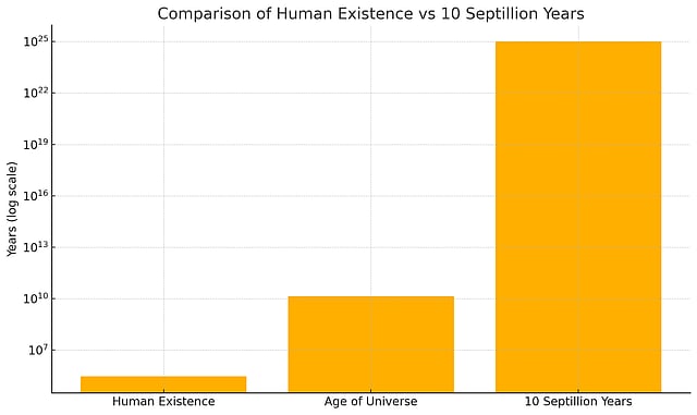Chart comparing human existence, the age of the universe, and 10 septillion years using a logarithmic scale. This highlights the vast difference in time scales between human history and the incomprehensible future timeframe of 10 septillion years