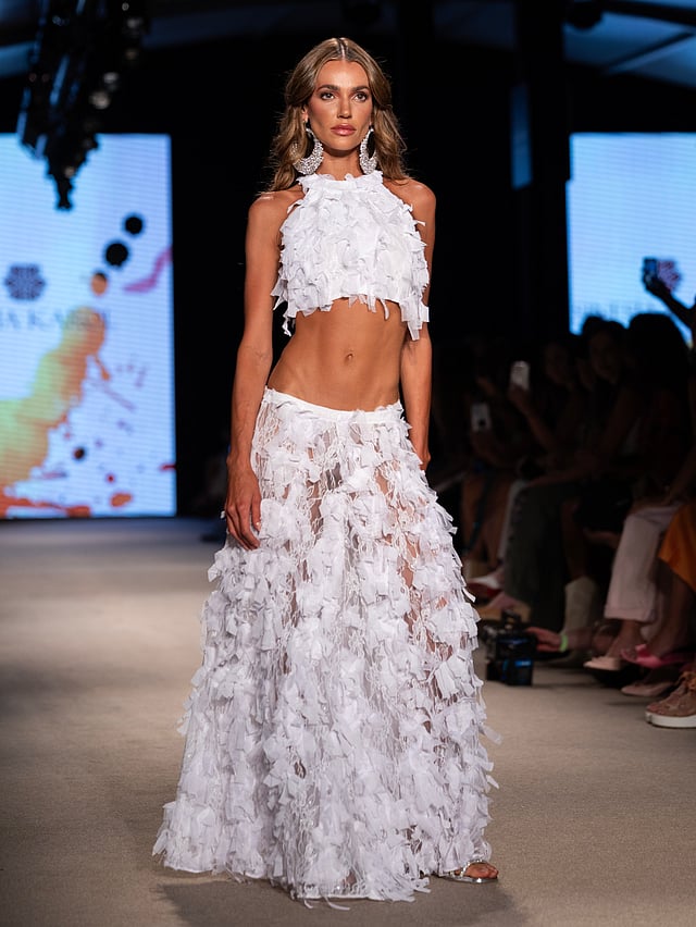 This intricately designed bikini and netted cover-up capture the 2024 summer trend of bold textures and daring silhouettes, perfect for fashion-forward beachgoers.