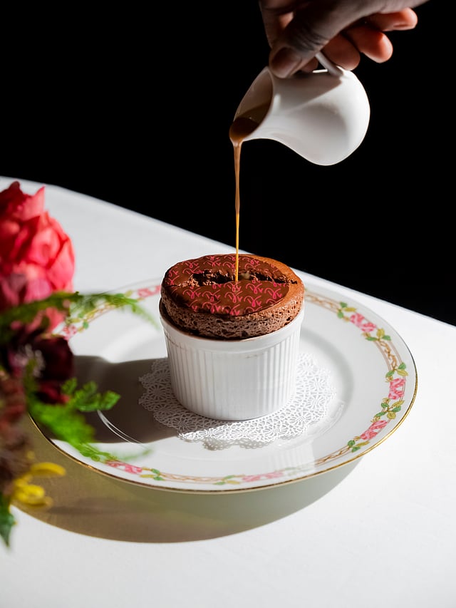 This interactive dessert invites you to "hit" a tower of chocolate cake, releasing a flood of vanilla cream over layers of devil’s food cake, brownie, and roasted white chocolate ice cream.