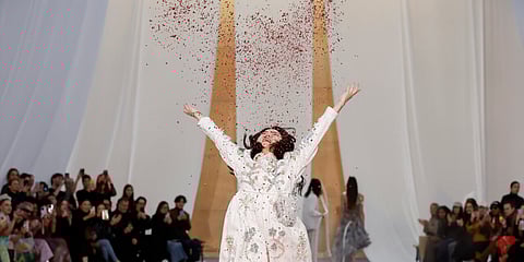 As a way to further make her mark on the weaving method of fabric design, Susan has taken remaining fabric scraps from previous seasons, turned them into yarn, and then, along with ribbons and wool, woven these strips together. These woven vines are then embellished with crystal clear beads before being shaped by hand onto mannequins to create various silhouettes seen throughout the collection. This is a labor of love, sometimes taking up to two weeks just to complete a single piece. Within the collection, this fabric design can be seen either gently wrapped around the main body of a piece, adding an ethereal beauty, or solidified into the clothing in the form of flower motifs. These floral pieces are further added to with petals made from hand-folded fabrics, which we have been calling "air-flowers," mirroring the beauty of unfolding flower blooms in nature. It is thanks to all of these unique elements, that each piece produced, will truly be its own, a "one of one."