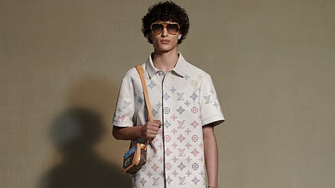 The Damier pattern, one of Louis Vuitton’s most recognizable elements, is deconstructed and reimagined in Look 3. Silk bowling sets, denim cargo suits, and statement blousons are adorned with fading color gradients, creating an almost digitalized effect.