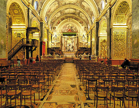 Outstanding is the St. John's Co-Cathedral, a high Baroque church used by the Knights of Malta, replete with intricately carved gilded designs, frescoed vaulted ceilings and side chapels with scenes from the life of St. John. Since the Knights were members of Europe's leading aristocratic families, each family had to commit a third of their annual income to the Order; and all of the Knight's property to the church upon his death. It has eight chapels, each belonging to one of the eight national groups, which made up the Order. The Cathedral houses Europe's most exquisite collection of Caravaggio's paintings, the most important being the "Beheading of John the Baptist".