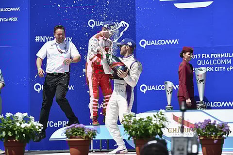 THE BROOKLYN BOROUGH OF NEW YORK CITY, NY – JULY 16: Winner Sam Bird of DS Virgin Racing with G.H. Mumm Champagne celebrates Formula E with Mumm Grand Cordon at the inaugural ePrix Race on July 16, 2017 in the Brooklyn borough of New York City, New York. (Photo by Bryan Bedder/Getty Images for G.H. Mumm)