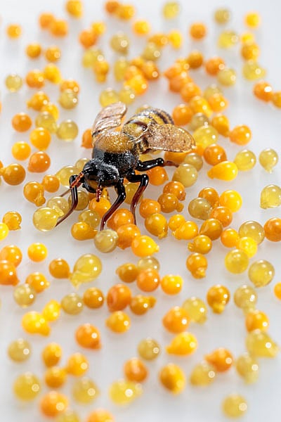 Always a curious and devout experimentalist, Harvest also created over 1000 different glass seeds, plants & flowers for the same exhibition. "I created these seed and plant works in Murano glass to further emphasize the sense of the fragility of life and the search for beauty that underlies all my work." Working alongside seven Murano glass masters, and employing three ancient and challenging Murano glass techniques: cera persa (lost wax), lume (flame work), and soffiato (blown), supple, liquid molten glass is magically transmuted into exquisitely detailed and delicate artistic representations of various animated life forms – the honey bee, a tomato, an open pomegranate (seeds and all), an olive branch, a tasty-looking coconut in halves, as well as a sparkling, crystalline, frozen honeycomb and frozen wheat, to name a few. These provide a mind-boggling glimpse into her absolutely detailed creative mind of Harvest, imbuing her life-like creations with intricacies and flourishes that are only apparent (and replicable) from an artist of her caliber.