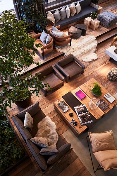 Nestled along the East River overlooking Manhattan's downtown district is a beautifully unique hotel filled with an atmosphere that combines modern luxury and nature to generate a colossal terrarium. With large floor to ceiling windows, open spaces and rustic wood elements accented by greenery this amazing terrarium is spacious, airy, and best of all, green.